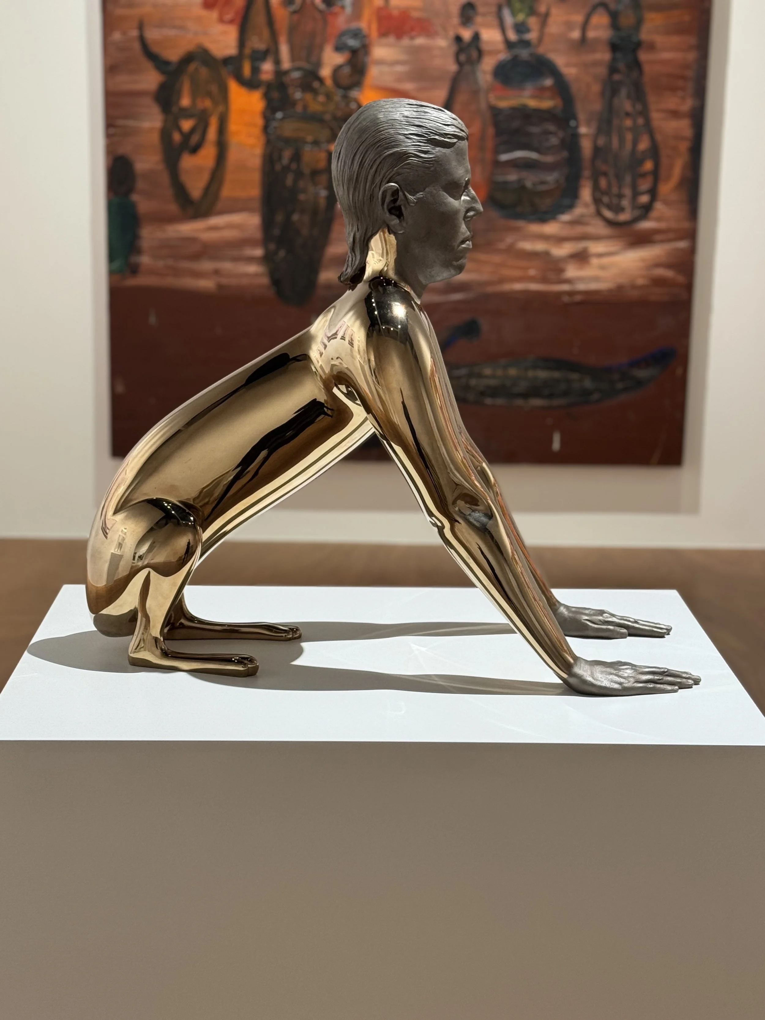 龐迪克於80年代後期便備受矚目,當時藝術家重新配置人類身體及象徵性物件,如鞋子、奶瓶和牙齒,挑戰觀者內心錯綜復雜的情緒反饋。90年代末期,她更首次將自己身體的一部份與動物和樹木結合,創作混合物種的雕塑。〈草原犬鼠〉為龐迪克延續其將人體視為變形與混種場域的探索。這件雕塑融合了人類與動物的身體部位,形成一種難以被輕易歸類的曖昧形態。作品以不鏽鋼鑄造,其具反射性的表面邀請觀者反思身體與環境、自我與他者之間流動而不穩定的界線。